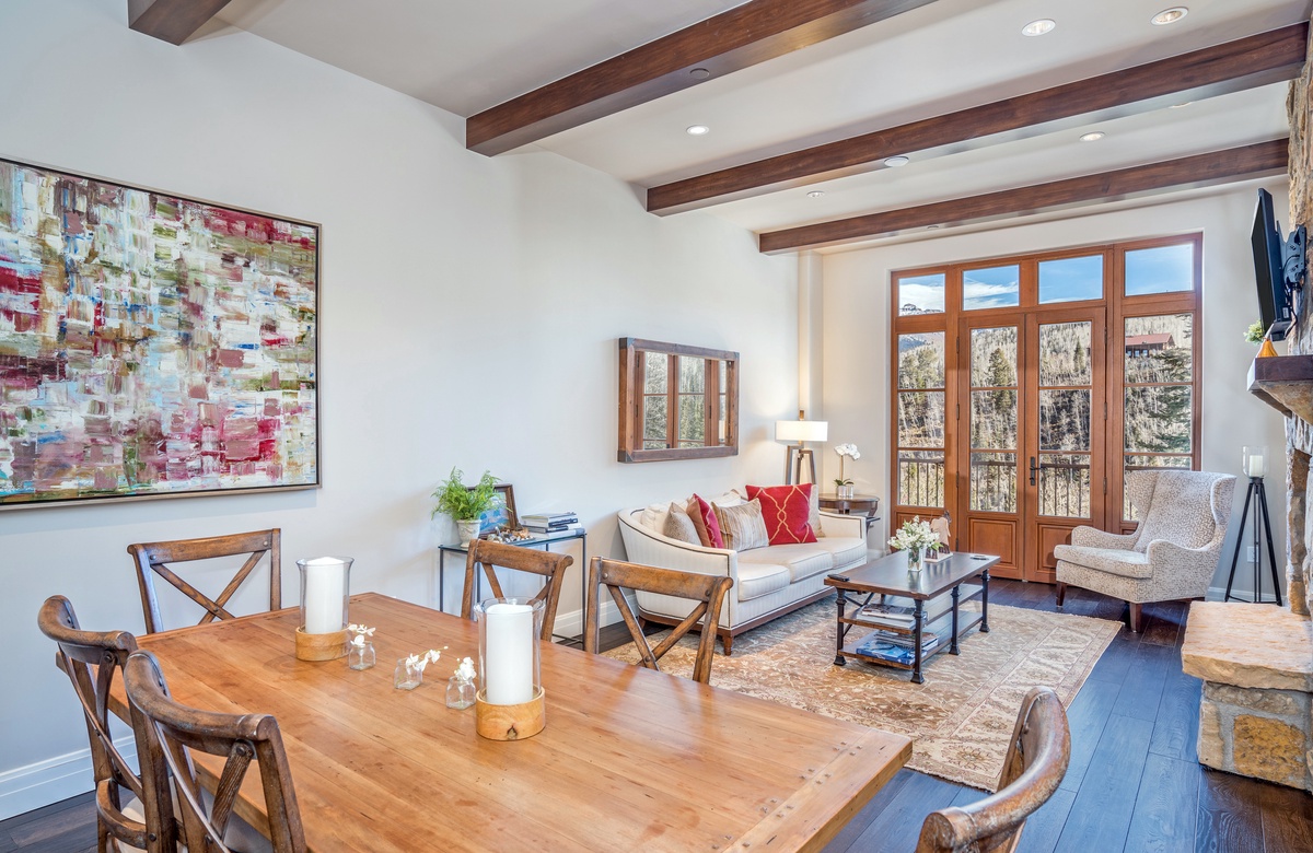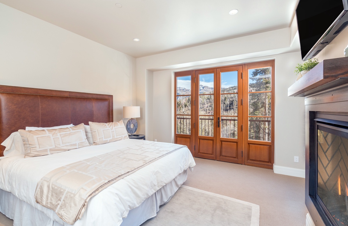 gas fireplace, large flatscreen TV, a shared terrace and big mountain views
